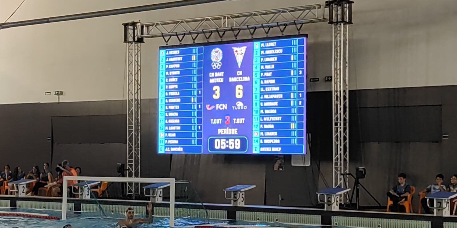 LA FEDERACIÓ CATALANA DE NATACIÓ volvió a utilizar el marcador de VIRTUALIA para la COPA DE CATALUNYA DE WATERPOLO. La flexibilidad de los marcadores de VITUALIA permiten de forma automática gestionar toda la información que se genera en los partidos de waterpolo integrando la información introducida por los árbitros con la información de los operadores que manejan el marcador. Esto permite disponer de estadísticas de equipo y de jugador desde el momento en el que se producen. El marcador de VITUALIA ofrece una amplia gama de posibilidades, no solo para disponer de un seguimiento exhaustivo del encuentro, también permite asignar publicidad a acciones de los jugadores, permite mostrar señales de televisión, cartelería digital, mensajes de texto y todo ello con la posibilidad de seguir mostrando la información del marcador simultáneamente. Los marcadores de VIRTUALIA son pioneros en ofrecer prestaciones novedosas que cubren las necesidades de los encuentros y competiciones más exigentes.